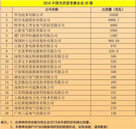 本次榜單包含七大類榜單,其中2016中國光伏逆變器企業(yè)20強(qiáng)排名如下:華為技術(shù)有限公司以出貨量10500兆瓦位居第一名,陽光電源股份有限公司出貨量8906.7兆瓦和特變電工西安電氣科技有限公司出貨量4000兆瓦進(jìn)入前三。