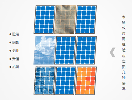 第一,避免了集中型逆變器電站的木桶效應(yīng)(如下圖)。集中式并網(wǎng)逆變系統(tǒng)中,組件方陣經(jīng)過(guò)兩次匯流到達(dá)逆變器,逆變器最大功率跟蹤功能(MPPT)不能監(jiān)控到每一路組件的運(yùn)行情況,因此不可能使每一路組件都處于最佳工作點(diǎn),當(dāng)有一塊組件發(fā)生故障或者被陰影遮擋,會(huì)影響整個(gè)系統(tǒng)的發(fā)電效率。所以當(dāng)電池組件受到遮擋時(shí),集中型電站會(huì)受到較大的影響,組串型電站只有被遮擋的一串對(duì)應(yīng)的一路MPPT受到影響。而正常情況下,各個(gè)組件之間的安裝間距,安裝角度各異,一天中一定時(shí)間內(nèi)不可避免會(huì)產(chǎn)生局部遮擋,特別是早晚時(shí)刻太陽(yáng)高度角較低的時(shí)候,或者出現(xiàn)一些植被遮擋一些電池片。若一個(gè)500KW方陣的電池板使用一路MPPT來(lái)跟蹤,會(huì)損失一定的發(fā)電量。該情況同樣適用于當(dāng)電池組件發(fā)生臟污、陰影、老化、升溫、熱斑的情況下。
