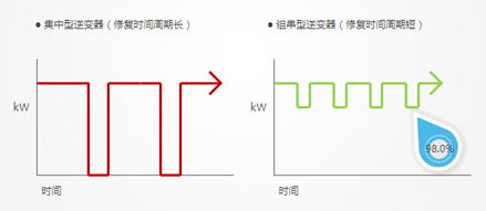 原因二:組串式逆變器還具有自耗電低、故障影響小、更換維護(hù)方便的優(yōu)勢(shì)。集中型逆變器自身耗電以及機(jī)房通風(fēng)散熱耗電大,系統(tǒng)維護(hù)相對(duì)復(fù)雜,出現(xiàn)故障時(shí),整個(gè)電站會(huì)癱瘓,組串型逆變器出現(xiàn)故障時(shí),只有一串組件會(huì)停止發(fā)電,整個(gè)電站可以照常運(yùn)作,從而很大程度上降低了損失。另外,組串式并網(wǎng)逆變器的體積小、重量輕,搬運(yùn)和安裝都非常方便,不需要專業(yè)工具和設(shè)備,也不需要專門(mén)的配電室,在各種應(yīng)用中都能夠簡(jiǎn)化施工、減少占地,直流線路連接也不需要直流匯流箱和直流配電柜等。這就意味著組串型逆變器的修復(fù)時(shí)間周期要比集中式逆變器的修復(fù)周期短,下圖為集中型和組串型逆變器的修復(fù)時(shí)間周期對(duì)比。